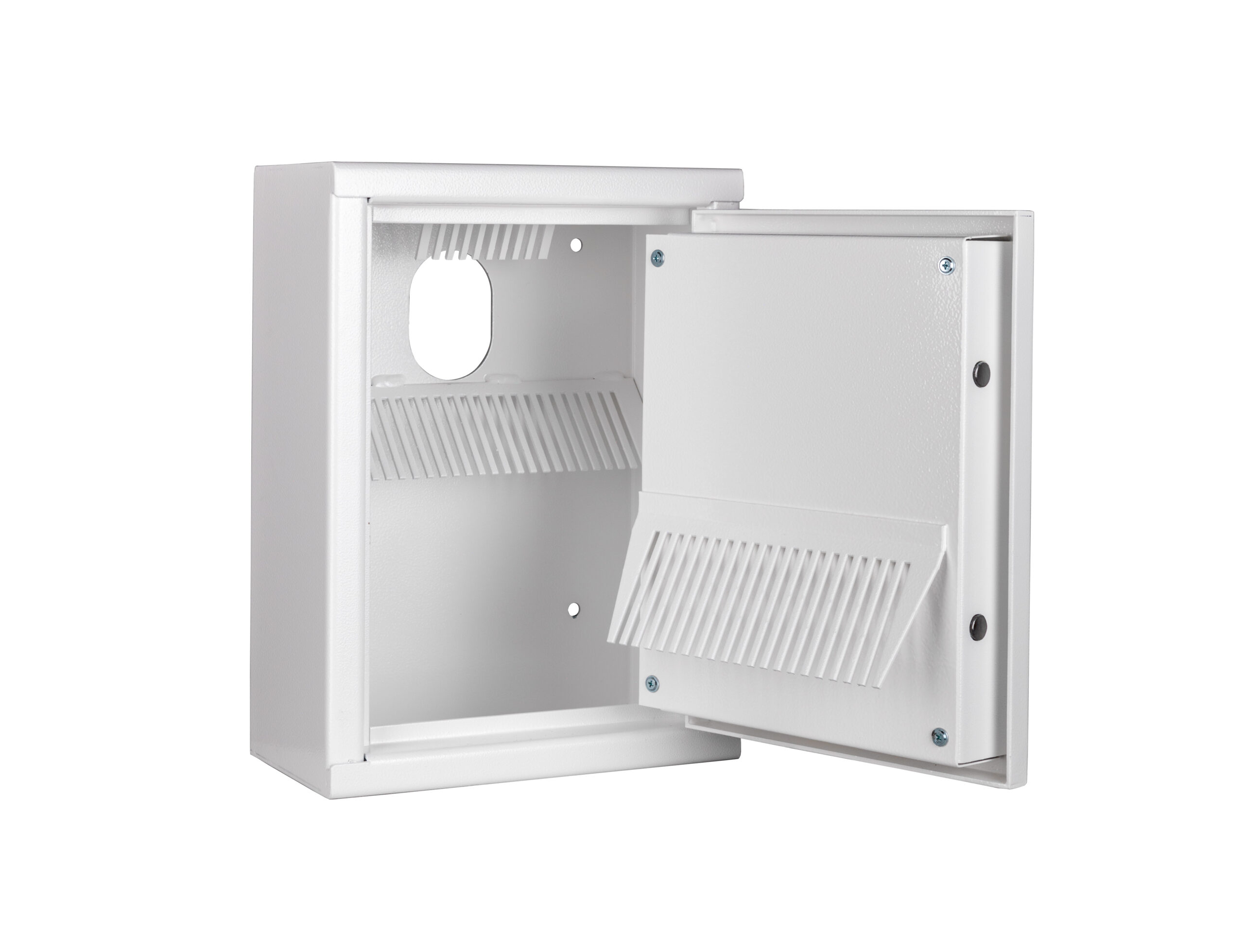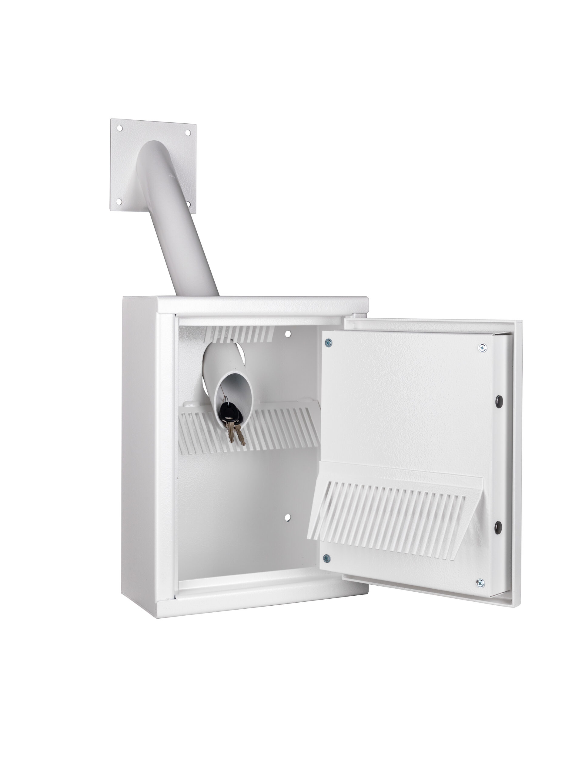 Nyckeldeponeringsbox i 3 mm stålplåt. Fiskskydd och hål för deponering i rygg eller ovanifrån. Genomföringsstos för deponering genom vägg säljs som tillbehör och finns i två längder. GS eller GSX.