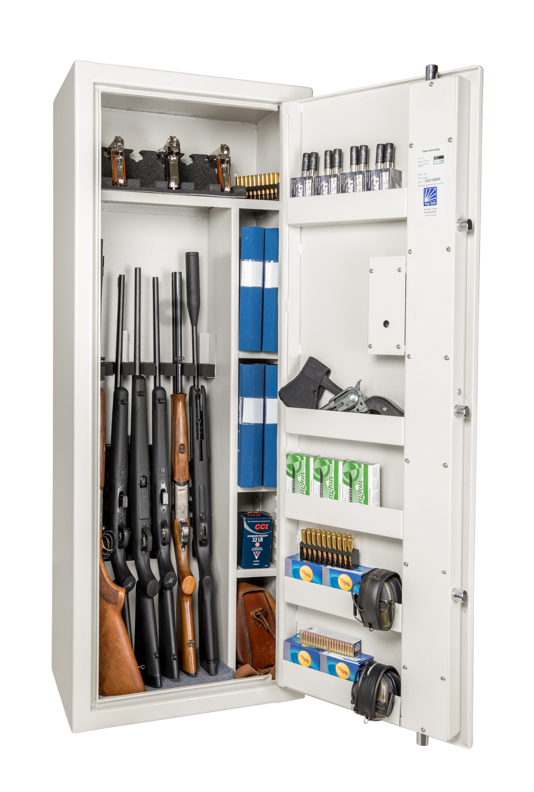 Vapenskåp Safir 16 är säkerhetsklassat enligt SSF 3492. Skåpet är tillverkat i 4mm stål. Skåpet är inrett med fem hyllfack på insidan av dörren och 4 sidohyllor inne i skåpet. Det är även en fast hylla ovan vapen som är perfekt för t.ex en brandbox.