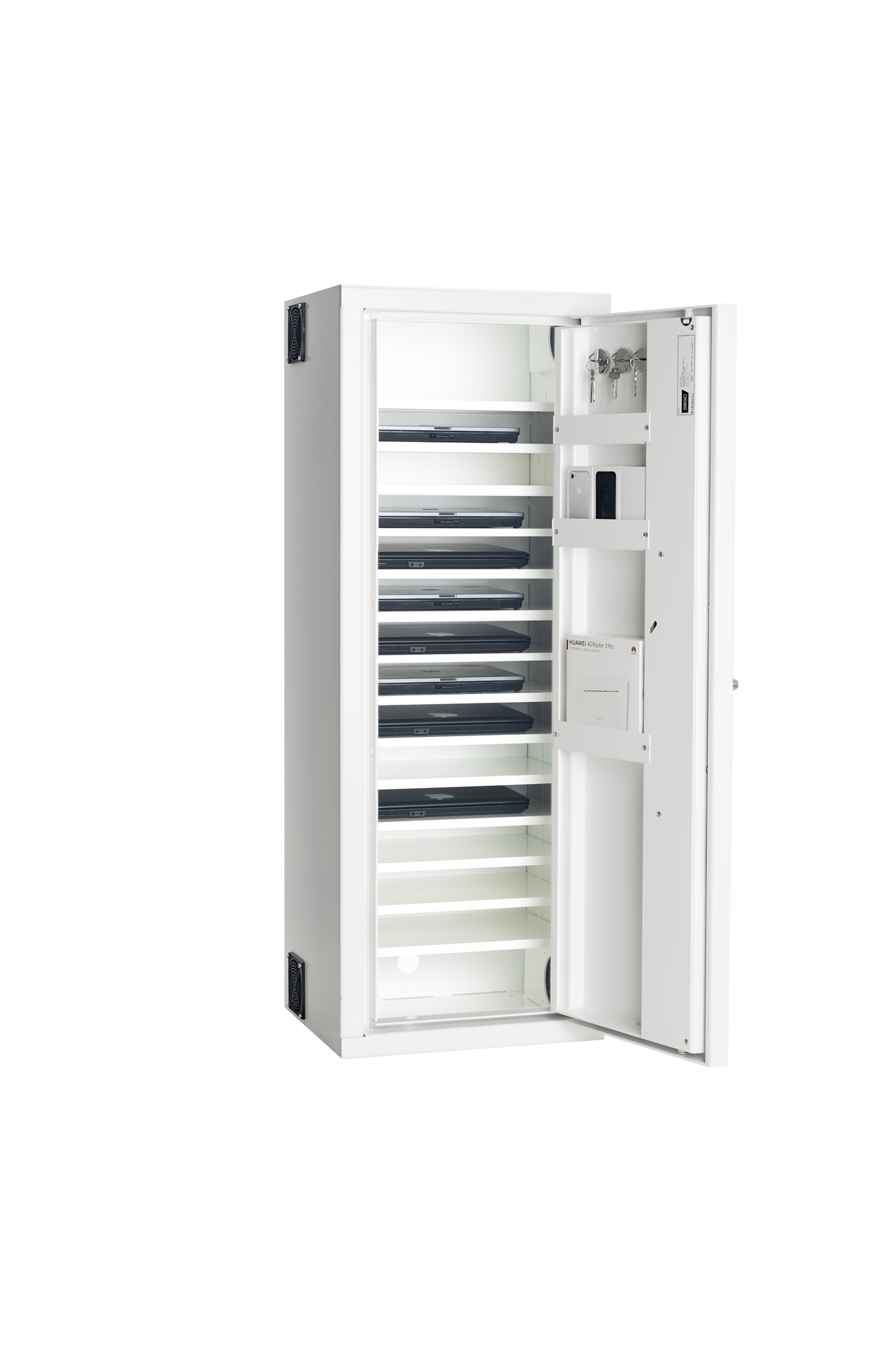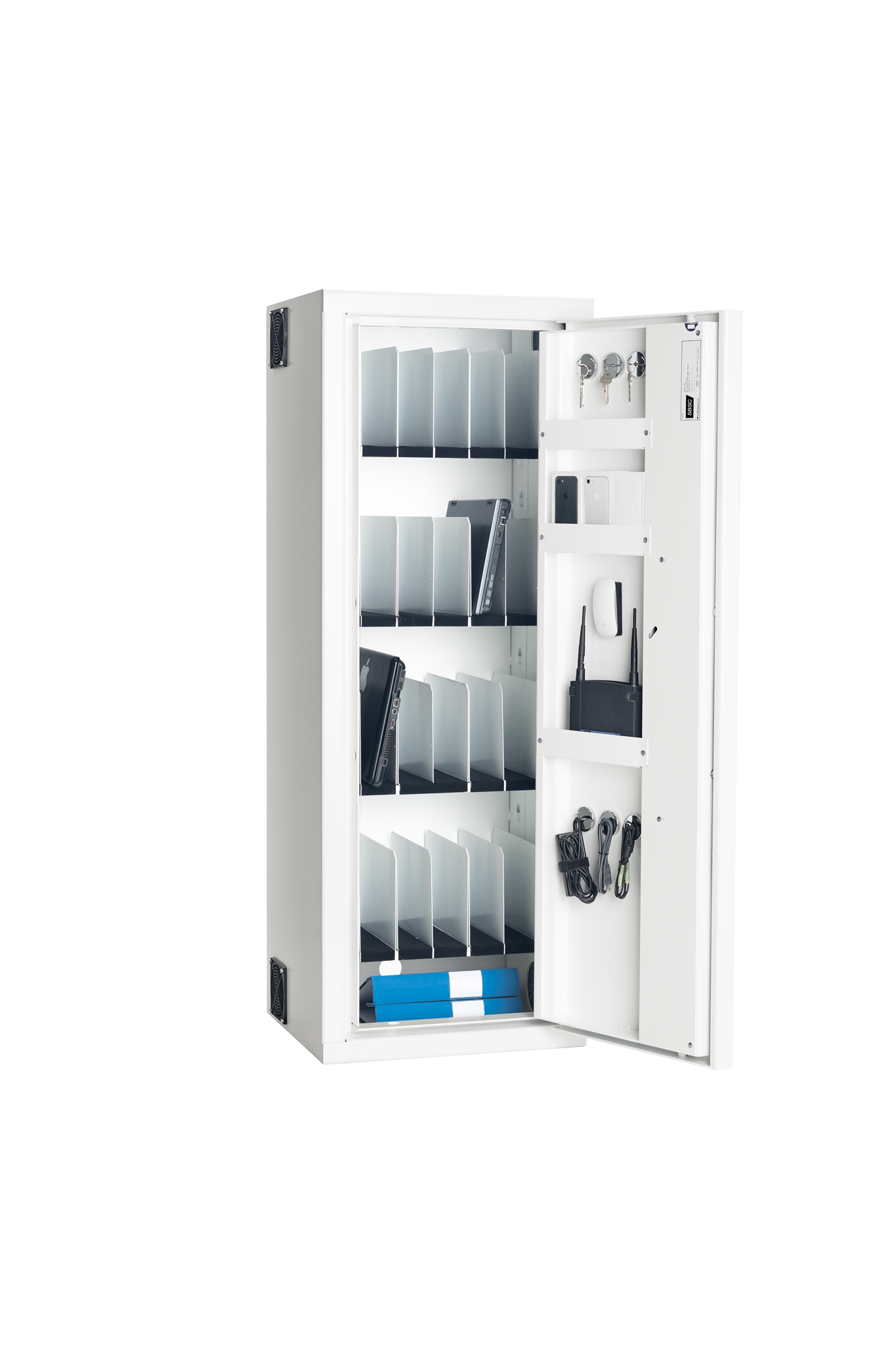 Passar utmärkt för säker förvaring av telefoner, laptops eller surfplattor. Skåpet går att utrusta med olika typer av kodlås, laptophållare, grenuttag, hyllplan, fläktpaket m.m. Levereras tomt som standard.